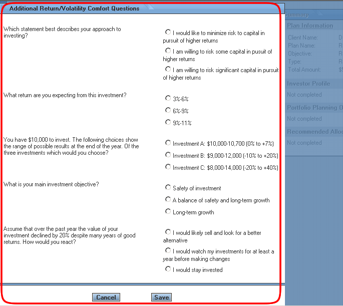 The Portfolio Planner provides a link to a set of questions that can be used to help determine an investor's return/volatility comfort or risk tolerance level. The table below shows the characteristics that are used to help determine if an investor return/volatility comfort is conservative, aggressive or somewhere in between.